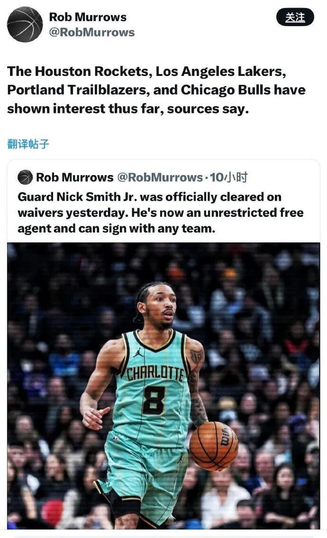 NBA记者Rob Murrows跟进报道,消息源透露,火箭、湖人、开拓者和公牛都展现出了签下这位后卫的兴趣。