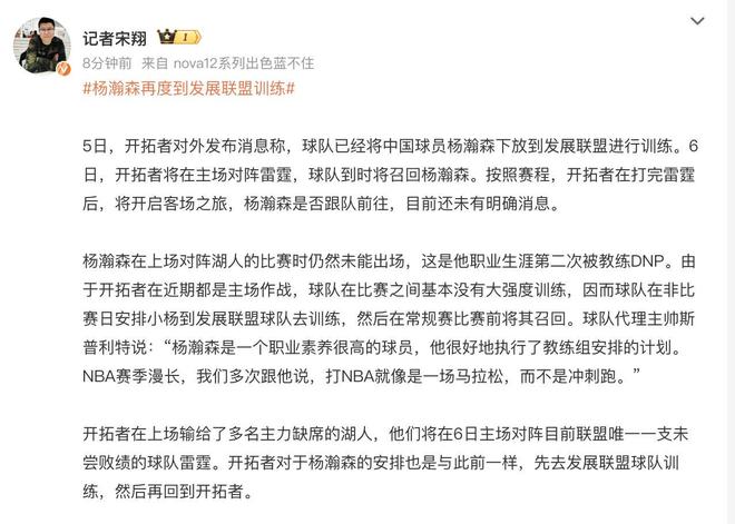 说实话对于教练组来说,如果他们确实有比较具体的培养计划的话,那应该对外说出来,也可以让大家能够更加安心的等待杨瀚森的成长。如果确定杨瀚森不会上场的话,就没有必要来回折腾,好像花了很大的阵仗把他下放然后又把他征召回来,给了球迷希望最后再给大家当头一棒,这种感觉其实是非常难受的。我们还是希望看到杨瀚森可以耐心的在发展联盟升级打怪,逐渐提升自己的能力,后续一旦有机会回到NBA的常规赛赛场,能够得到上场的机会然后一举证明自己。