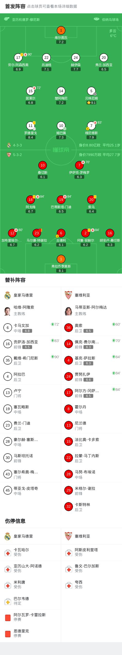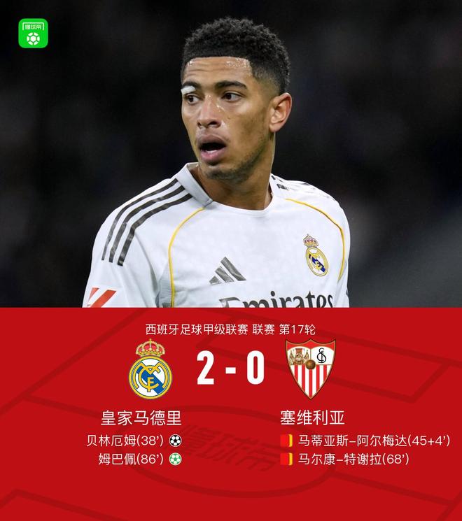 北京时间12月21日西班牙足球甲级联赛 联赛 第17轮,皇家马德里主场对阵塞维利亚。上半场,罗德里戈开出任意球,贝林厄姆头槌破门。下半场,特谢拉放倒贝林厄姆吃到第二张黄牌被罚下。罗德里戈造点,姆巴佩主罚命中。全场比赛结束,皇马2-0战胜塞维利亚。